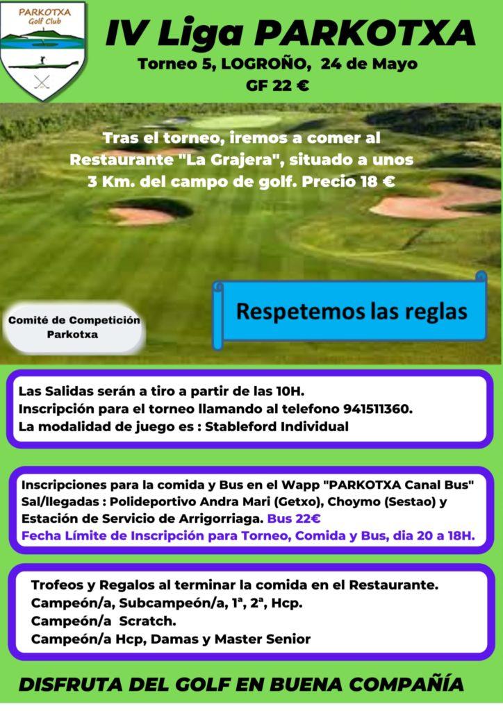 Nos desplazamos hasta Logroño para disputar el 5º  Torneo de la IV Liga Parkotxa el próximo día 24 de mayo en el campo de golf de  La Grajera.