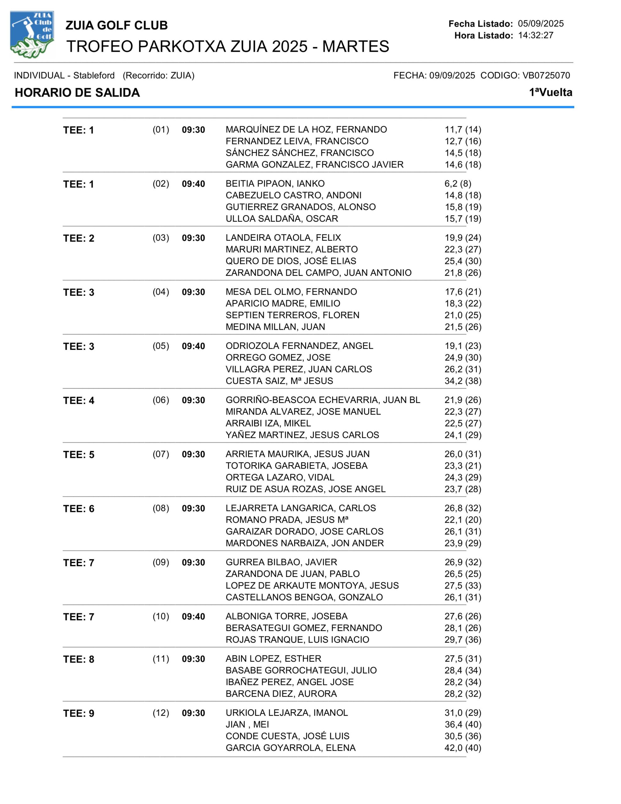 VII Liga Parkotxa. IX Torneo. Golf Zuia 8 y 9 de septiembre 2025