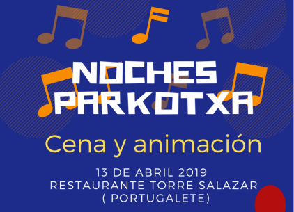 [vc_row css_animation="" row_type="row" use_row_as_full_screen_section="no" type="full_width" angled_section="no" text_align="left" background_image_as_pattern="without_pattern"][vc_column][vc_empty_space][vc_column_text] El próximo sábado 13 de Abril llega una nueva edición de nuestras Noches Parkotxa, en el Restaurante Torre Salazar de Portugalete. [/vc_column_text][vc_empty_space][vc_column_text] Las reservas se realizarán por riguroso orden de inscripción llamando al restaurante, hasta completar aforo. [/vc_column_text][vc_empty_space][/vc_column][/vc_row][vc_row css_animation="" row_type="row" use_row_as_full_screen_section="no" type="full_width"...