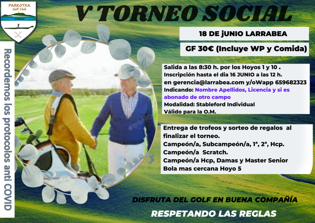 A pesar de las restricciones tenidas hasta la fecha, y puesto que habíamos planificado nuestro Torneo Social, sin tener muy claro que se iba a poder realizar, hemos tenido la suerte de que la situación de la pandemia ha mejorado considerablemnete y como consecuencia de la reducción de las restricciones, vamos a disputar el Social en el estupendo campo de Larrabea, el dia 18 de Junio.